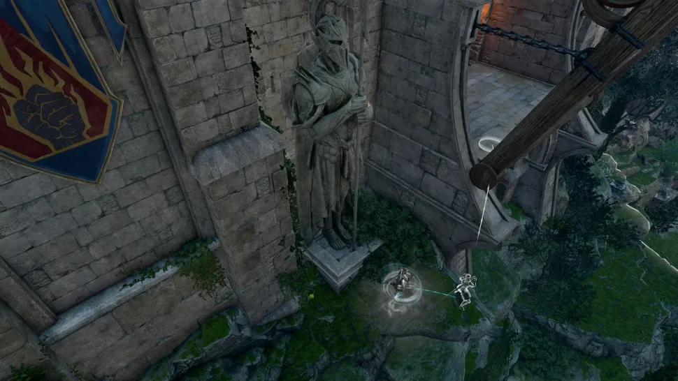 - Charaktere können entlang des Simses unter der Statue westlich der Zugbrücke gehen. Ein Gruppenmitglied, das diese Kante erreicht und über eine starke Sprungfähigkeit verfügt, kann über den Raum zwischen der Brücke und der Mauer springen.