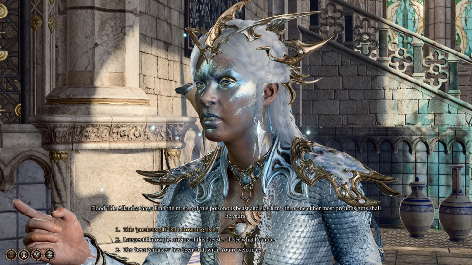 Allandra will Rache und wenn sie um Tribut gebeten wird, antwortet sie: „Ich habe meine Waffe mitgebracht, um ihren Tod zu rächen.“ Sie wird erklären, dass ihre Priesterin-Freundin bei einem Zusammenstoß mit einem „Metallmonster“, also einem Unterwasserfahrzeug, ums Leben kam. Danach bittet Allandra das Team, den Besitzer des Monsters zu töten, und im Tagebuch erscheint eine Aufgabe.