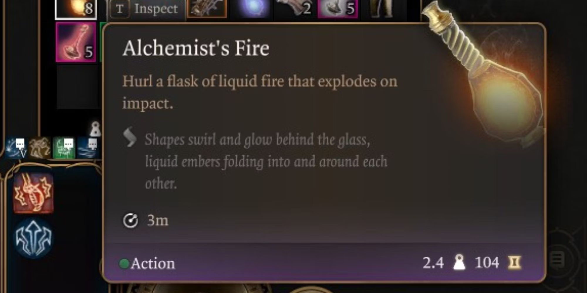 Feuer des Alchemisten, ein Granatengegenstand, fügt Feinden bei jedem Treffer 1W4 Schaden zu.