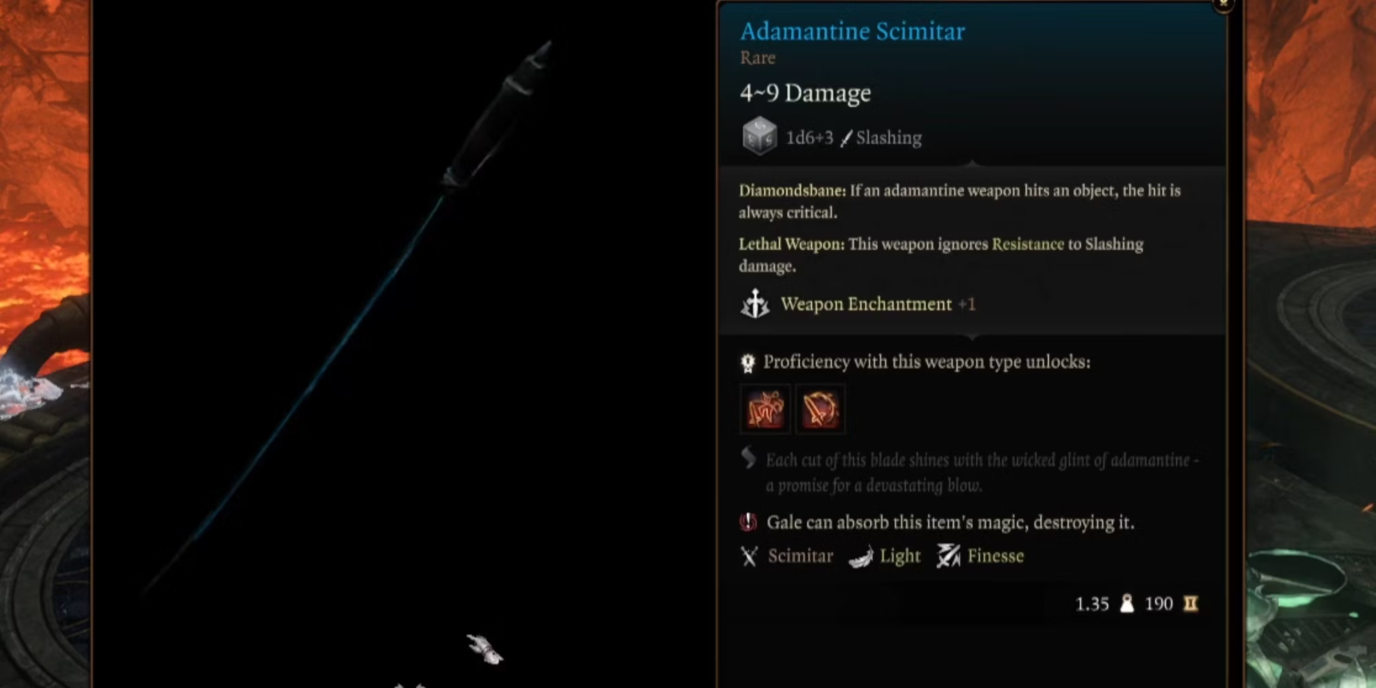Der Adamantine Scimitar ist eine Nahkampfwaffe, die bei jedem Treffer 1W6+1 Stichschaden verursacht. Es wendet auch den Taumel-Debuff für 1 Runde an.
