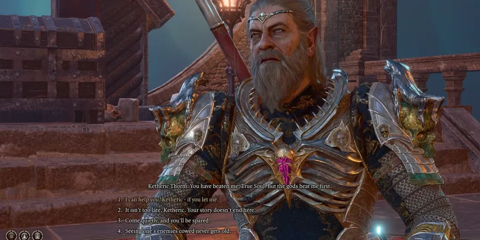 Wenn die Spieler das Dach erreichen, nachdem sie die Quelle der Unsterblichkeit beseitigt haben, wird Torm mit ihnen sprechen. Zwei der möglichen Antworten sind Fertigkeitsprüfungen, darunter eine Einschüchterungsprüfung gegen SG 21 und eine viel einfachere Überredungsprüfung gegen SG 10. Um die Überredungsprüfung freizuschalten, müssen die Spieler jedoch Moonrise Towers gründlich erkunden und herausfinden, was mit der Frau Keterika passiert ist. Melodie. Ein Einschüchterungswurf führt zu einem weiteren Fertigkeitswurf von DC 30, aber Spieler von Baldur's Gate 3 können zwischen Überreden, Einschüchtern und Täuschung wählen. Andererseits erfordert der Melodia-Check keine zusätzlichen Würfe.