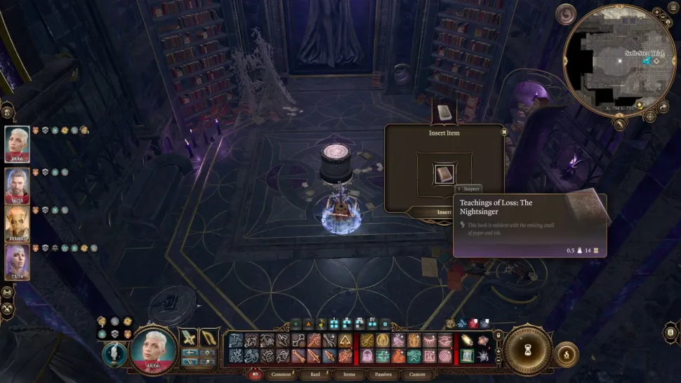 Um das Rätsel „Das Rätsel der Nacht“ zu lösen, müssen Baldur's Gate 3-Spieler ein Buch in die Hände bekommen, das sich in der Stillen Bibliothek befindet. Das Buch heißt insbesondere „Teachings of Loss: The Nightsinger“ und Sie können es aus dem Bücherregal an den Koordinaten X:-771 Y:-742 nehmen. Bemerkenswert ist, dass dieses Regal zunächst eine Falle ist und mit einer erfolgreichen Geschicklichkeitsprüfung der Schwierigkeit 14 entschärft werden kann.