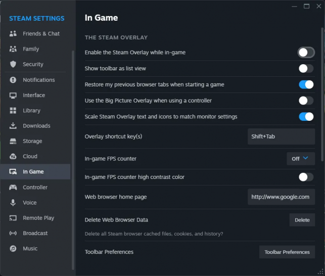 - Deaktivieren Sie die Option „Steam-Overlay während des Spiels aktivieren“.