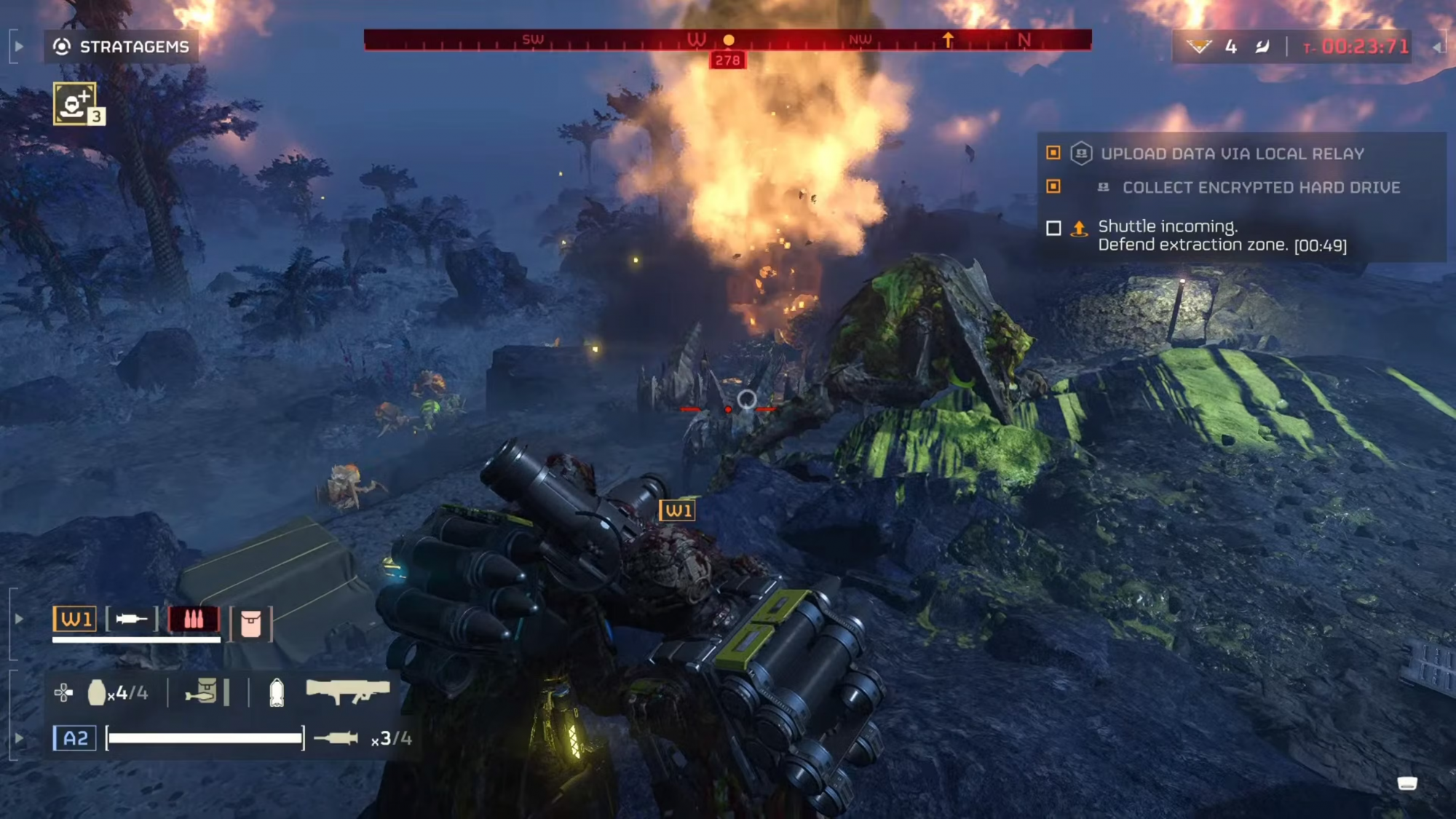 Neben den Hauptwaffen dieses Builds sind die Orbital Railcannon Strike, die Eagle 500Kg Bomb und der A/MLS-4X Rocket Sentry die am meisten Chaos erzeugenden Kriegsgefechte im Spiel. Der Orbital Railcannon Strike feuert immer einen Schuss auf Panzer ab und die Eagle 500 Kg Bomb verursacht massiven Explosionsschaden, hat aber eine kurze Reichweite, was sie ideal für die Atombombe in einem infizierten Bereich macht.