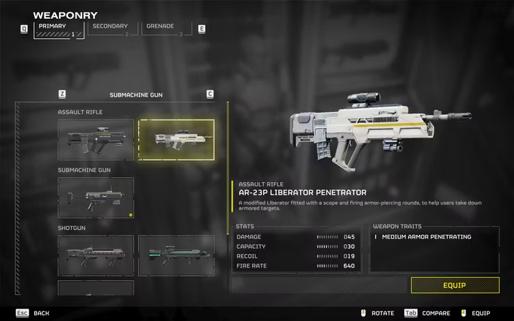 Der AR-23P Liberator Penetrator ist die ideale Waffe, um auf Terminiden und Automaten zu zielen und gleichzeitig in der Nähe aggressiver Truppkameraden zu bleiben. Die Pistole verfügt über die Waffeneigenschaft „Medium Armor Penetration“, was bedeutet, dass die meisten abgefeuerten Kugeln die Panzerung des Feindes durchdringen.
