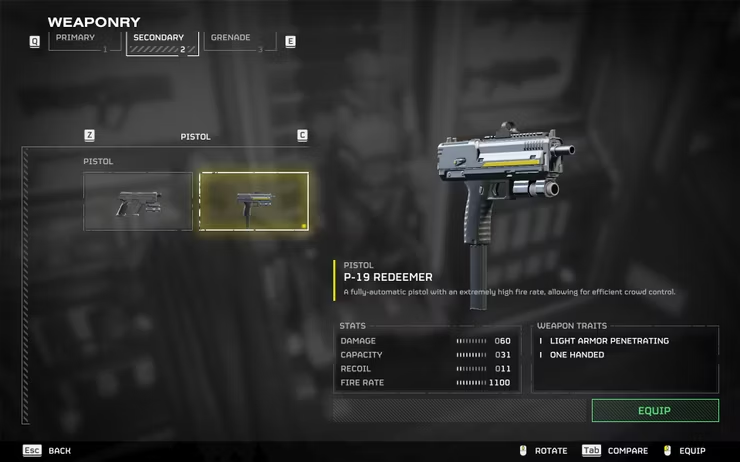 Wenn das Magazin Ihres AR-23P Liberator Penetrator keine Munition mehr hat, wechseln Sie immer zur P-19 Redeemer, der besten Sekundärpistole im Spiel. Die Waffe hat eine Feuerrate von 1100 Einheiten und einen Schaden von 60 Einheiten, was ausreicht, um einen Brood Commander mit einem Schuss zu töten, der auf den Kopf zielt.