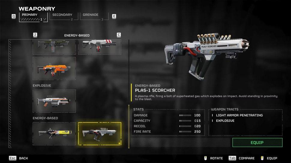 Aus praktischer Sicht spielt diese Waffe eine ähnliche Rolle wie der JAR-5 Dominator in Helldivers 2. Beide sind für den Umgang mit mittelschwer gepanzerten Gegnern konzipiert und beide sind im Umgang mit Gruppen schrecklich. Der Dominator verursacht deutlich mehr Schaden, insbesondere gegen Schwachstellen, aber seine Kugeln prallen von mittlerer Panzerung ab, wenn sie aus einem schlechten Winkel treffen, und er ist deutlich langsamer als der Scorcher.
