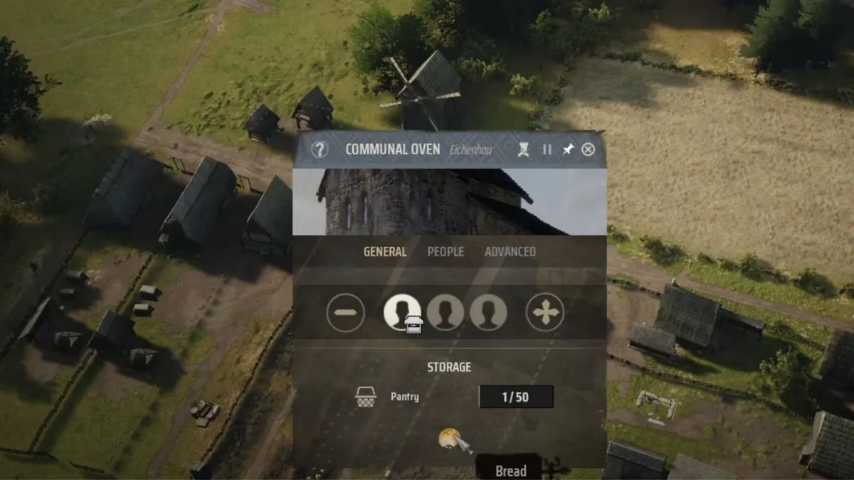 Der letzte Schritt ist das Backen von Brot aus Mehl. Auf dem Grundstück auf der 2. Ebene können Sie einen gemeinsamen Ofen oder, für mehr Effizienz, einen Bäckereianbau bauen. Weisen Sie diesen Einrichtungen Arbeiter zu und sie beginnen mit der Produktion von frischem Brot für Ihre Siedlung.