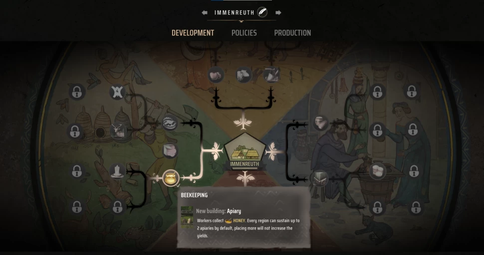 Das Bienenhausgebäude in Manor Lords befindet sich im Entwicklungszweig „Imkerei“. Um es zu entsperren, wählen Sie den oben auf dem Bildschirm angezeigten Regionsnamen aus und suchen Sie dann den Zweig „Imkerei“. auf der Registerkarte „Entwicklung“.