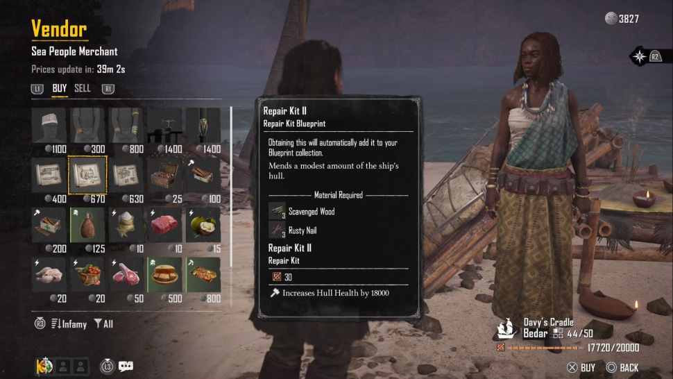 Es gibt mehrere Orte, an denen Sie Reparatursätze finden, plündern oder kaufen können. Die häufigsten davon sind Händler, die Sie in fast jeder Siedlung im Spiel finden. Händler sind im Spiel unglaublich nützlich, da sie Sie nicht nur mit Waren wie Reparatursets versorgen, sondern auch wichtige Werkzeuge wie ein Brecheisen herstellen und aufrüsten können. Darüber hinaus können Reparatursätze als Teil der Ladung versunkener Schiffe auf Inseln oder in den Überresten eines sinkenden feindlichen Schiffes gefunden werden.