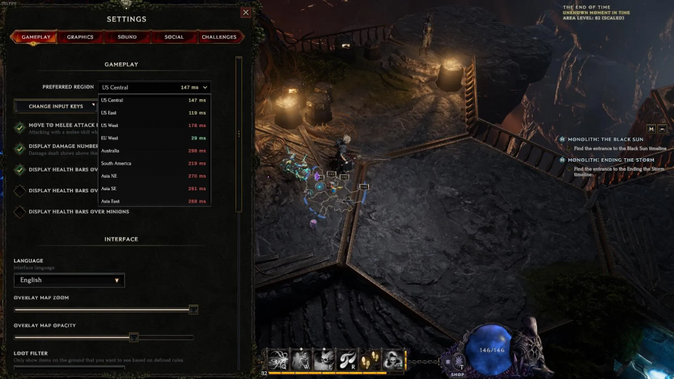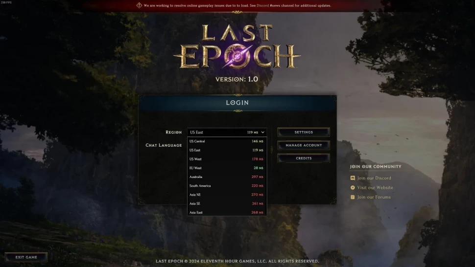 Cualquier problema que te haga quedarte atascado en la conexión o en la pantalla de carga se debe a la carga del servidor debido a que demasiados jugadores intentan jugar en el mismo servidor al mismo tiempo. En la mayoría de los juegos, una vez que creas un personaje en una región, estás limitado a jugar solo en esa región. Afortunadamente, este no es el caso en Last Epoch y puedes cambiar de servidor. Para divertirte más y evitar por completo las colas, puedes cambiar la región del servidor a una donde no haya mucho tráfico en este momento. Por ejemplo, si juegas en Europa, puedes intentar iniciar sesión en el servidor central o este de EE. UU.