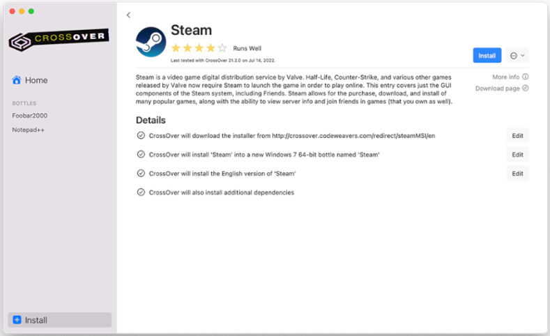 CrossOver, desarrollado por CodeWeavers, es una capa de compatibilidad de Windows para macOS, ChromeOS y Linux. Permite que muchas aplicaciones basadas en Windows se ejecuten en estos sistemas operativos sin virtualización. Si bien trabajar con capas de compatibilidad puede resultar un desafío, CrossOver incluye herramientas de configuración fáciles de usar, scripts de instalación automatizados y soporte técnico. A diferencia de Parallels Desktop, CrossOver admite juegos DirectX12. En general, esta es una forma bastante sencilla de ejecutar programas y juegos de Windows en dispositivos que no son Windows. Entonces puedes jugar Supermarket Simulator en Mac usando CrossOver.