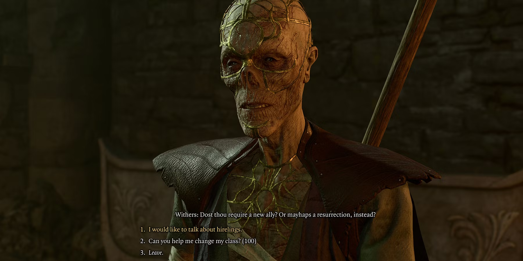 Cependant, le joueur peut utiliser une petite astuce pour obtenir le parchemin de renaissance via Withers. En arrivant au camp du joueur, Withers lui propose de recruter de nouveaux membres du groupe, appelés Hirelings, pour seulement 100 pièces d'or. Le joueur devra faire de la place dans son groupe pour un nouvel allié, mais le mercenaire peut être renvoyé et faire de la place dans le groupe simplement en reparlant à Withers.