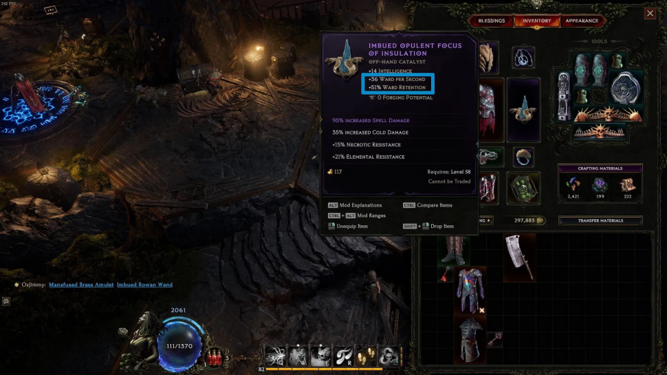 Ward est essentiellement un bouclier magique qui fournit une couche protectrice au-dessus de votre réserve de HP. C'est essentiellement la même chose que le bouclier énergétique dans Path of Exile, mais le mécanisme de son fonctionnement est différent. Si vous disposez d'une protection Ward, lorsque vous recevez des dégâts, le compteur Ward s'épuisera avant les HP. Il est généré à l’aide de certains équipements ou compétences et peut être accumulé sans limites. Visuellement, la présence de Ward est indiquée par une teinte bleutée au-dessus du cercle de santé, accompagnée d'une valeur numérique reflétant le niveau de protection actuel.