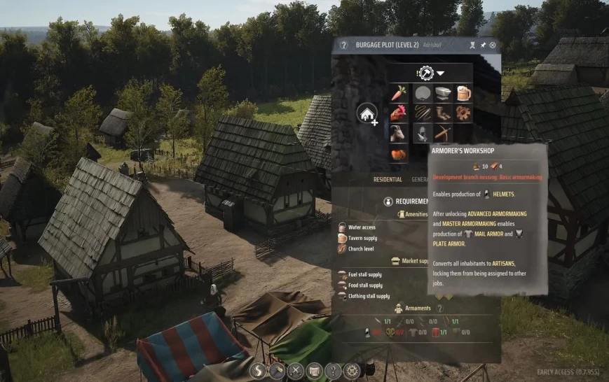 Améliorer les zones de hamburgers et ajouter des extensions telles que des forgerons ou des fletchers peut être tentant en raison des avantages qu'elles offrent. Cependant, ajouter de telles extensions trop rapidement peut transformer des familles de cols bleus ordinaires en familles d'artisans qui n'effectuent plus de travail standard. Cela peut conduire à négliger des tâches importantes si la croissance démographique ne suit pas le rythme de la demande de main-d’œuvre. Il est important de trouver un équilibre entre ces améliorations et de s'assurer qu'il y a suffisamment de familles de travailleurs réguliers pour soutenir les fonctions de base de votre colonie.