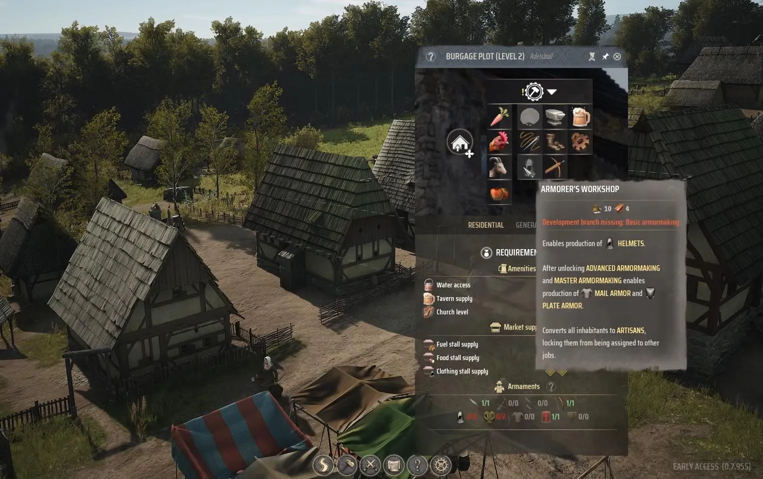 Améliorer les zones de hamburgers et ajouter des extensions telles que des forgerons ou des fletchers peut être tentant en raison des avantages qu'elles offrent. Cependant, ajouter de telles extensions trop rapidement peut transformer des familles de cols bleus ordinaires en familles d'artisans qui n'effectuent plus de travail standard. Cela peut conduire à négliger des tâches importantes si la croissance démographique ne suit pas le rythme de la demande de main-d’œuvre. Il est important de trouver un équilibre entre ces améliorations et de s'assurer qu'il y a suffisamment de familles de travailleurs réguliers pour soutenir les fonctions de base de votre colonie.