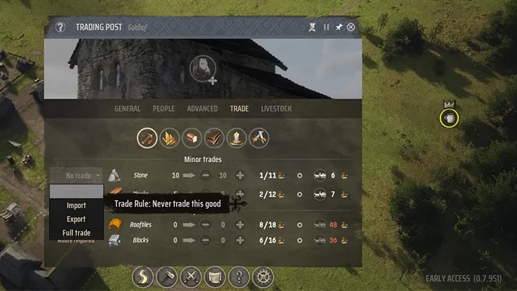 Vous pouvez également importer de l'orge ou de la bière chez Manor Lords en utilisant un poste de traite. Il est généralement préférable d'importer de l'orge, car la bière finira par vous coûter beaucoup plus cher et vous devrez établir une route commerciale qui nécessite une source constante de richesse régionale en provenance de votre colonie.
