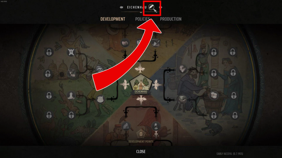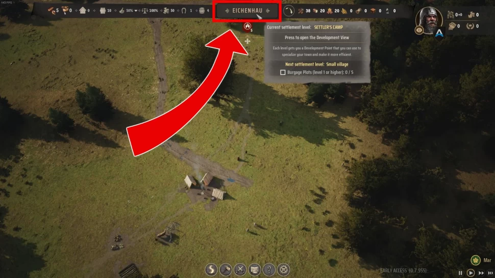 Chaque fois que vous démarrez une nouvelle partie dans Manor Lords, la première région dans laquelle vous commencez votre voyage aura un nom aléatoire. Pour changer ce nom, regardez en haut de l'écran et cliquez sur le nom de la région, qui se situe entre statistiques et ressources. Si vous cliquez sur le titre, vous serez redirigé vers le menu de développement, où vous pourrez retrouver l'arbre de progression complet du jeu, ainsi que les sections « Politique ». et "Production".