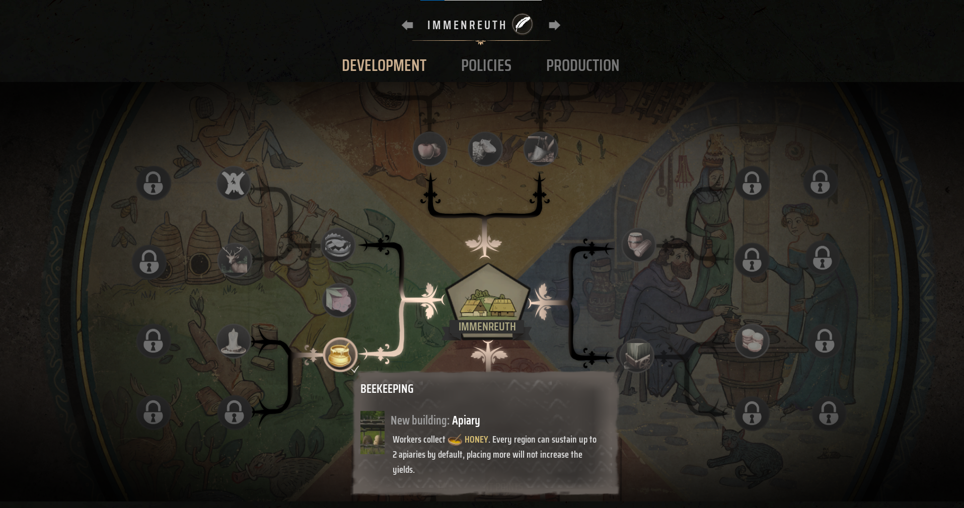 Le rucher de Manor Lords est situé dans la branche de développement appelée « Apiculture ». Pour le déverrouiller, sélectionnez le nom de la région affiché en haut de l'écran, puis recherchez la branche « Apiculture ». sur l'onglet "Développement".