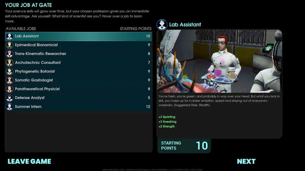 Для начала давайте рассмотрим вакансию лаборанта. Эта работа - скорее начальная, то есть у вас будет 10 стартовых очков, чтобы развивать свои способности в более специализированных областях, которые вам нужны. Если вы будете работать ассистентом в лаборатории, то, скорее всего, вам захочется сосредоточиться на стелсе, так как ассистенты обычно умеют не лезть на рожон, быстро выполнять поставленные перед ними задачи и просто проявлять много амбиций. Для начала у вас будут следующие очки: