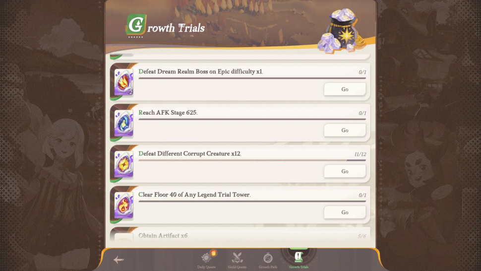 Вы можете просмотреть требования и задания для каждого Осколка Артефакта, зайдя в раздел Испытания Роста и прокрутив его до тех пор, пока не увидите конкретный квест.