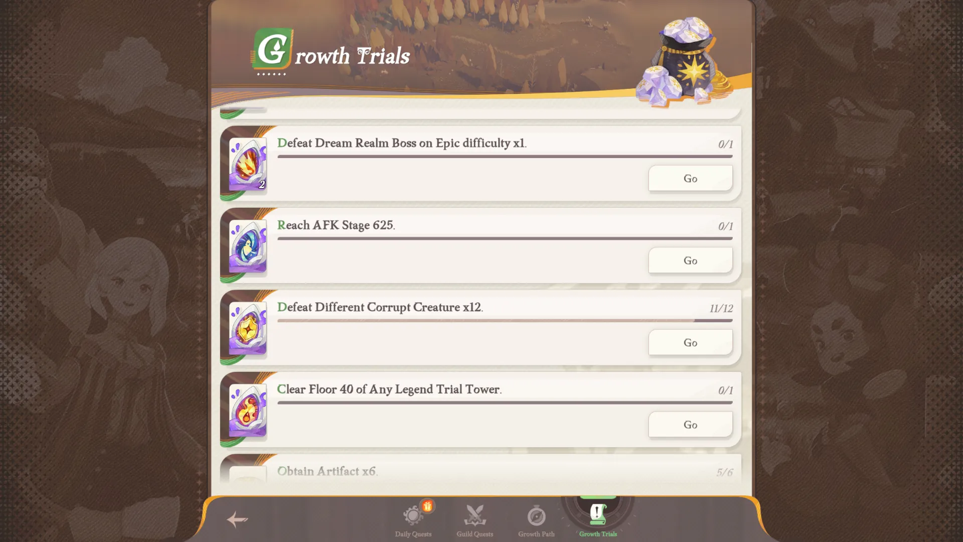 Вы можете просмотреть требования и задания для каждого Осколка Артефакта, зайдя в раздел Испытания Роста и прокрутив его до тех пор, пока не увидите конкретный квест.