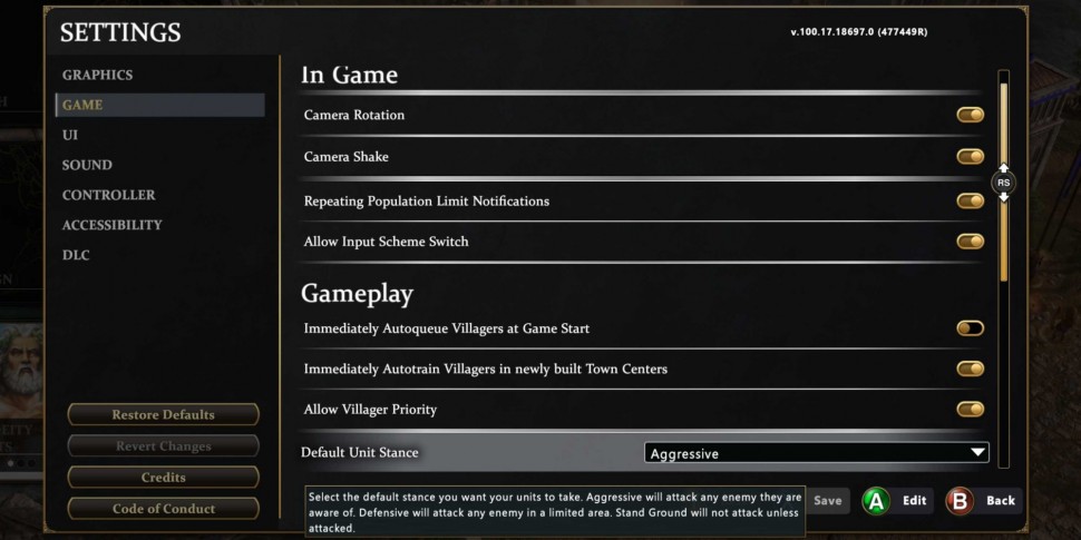 Прежде чем приступить к сражению, фанаты захотят настроить параметры игры в Age of Mythology: Retold, чтобы после начала матча сразу же вести себя в соответствии с их предпочтениями. На главном титульном экране геймерам нужно открыть меню в правом верхнем углу экрана и выбрать пункт «Настройки».