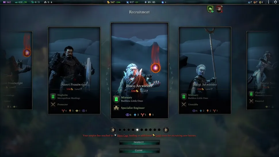 Можно нанять героя и без повышения лимита героев, но это обойдется в дополнительные 200 золотых вперед и 30 золотых на содержание за ход. Для справки, все герои, находящиеся ниже уровня героя, имеют нулевую стоимость содержания. Игроки также не могут увольнять героев, как обычных юнитов, поэтому единственный способ избавиться от них - отправить их в самоубийственную битву и продать их останки (за исключением правителя фракции, который всегда будет возрождаться).