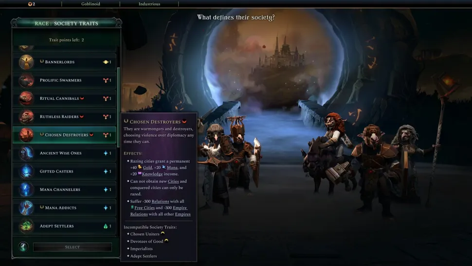 - Избранные Разрушители: 1 Сродство Хаоса, -10 Союзничество, не могут строить или завоевывать новые города, но каждый разрушенный город приносит постоянный доход +40 золота, +20 маны и +20 знаний. Кроме того, фракция начинает с -300 отношений со всеми другими свободными городами и фракциями.