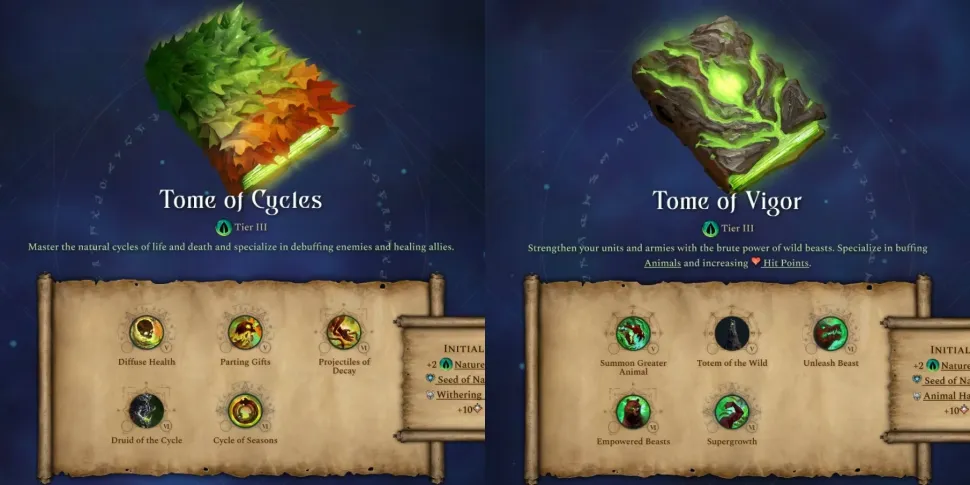 Tome of Cycles фокусируется на заклинаниях, балансирующих между положительными и отрицательными эффектами, и сразу же открывает навык героя Withering Decay. Кроме того, Diffuse Health и Parting Gifts позволяют игрокам превращать смерть и разрушение в исцеление для своих собственных юнитов, и они особенно сильны в армиях, нагруженных ближним боем, из создателя фракций Age of Wonders 4. Это дополняет друида цикла, который может как воскрешать союзников, так и мгновенно убивать раненых врагов.