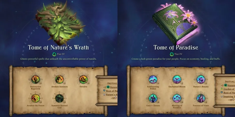 В "Томе плодородия" основное внимание уделяется росту и восстановлению, и он сразу же открывает "Щедрые поля", производящие пищу, и навык "Оживление героя". На поле боя "Цветение жизни" - это мощное исцеляющее заклинание, способное восстановить HP целой армии. Animate Flora стоит недорого для своей силы, но стимулирует игроков сражаться на местности, где есть препятствия для превращения Флоры. Между тем, Нимфа - это мощный юнит поддержки, который может лечить, наносить урон и даже управлять сознанием вражеских юнитов.