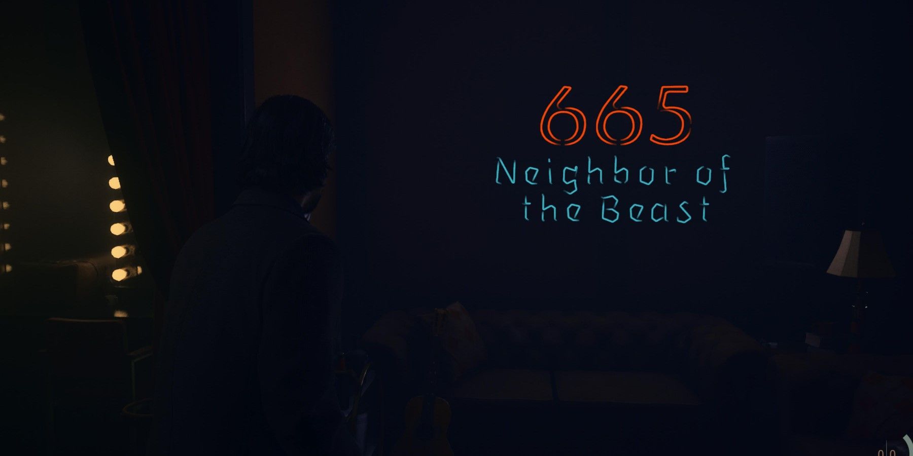 Затем игроки должны пройти в другой конец коридора, где есть еще несколько комнат. Войдя в одну из них, игроки окажутся в зеленой комнате для группы шоу "Старые боги Асгарда". Рядом с зеркалами в этой комнате находится мигающая неоновая надпись "665. Сосед зверя". Это первый код для указанной выше клавиатуры.