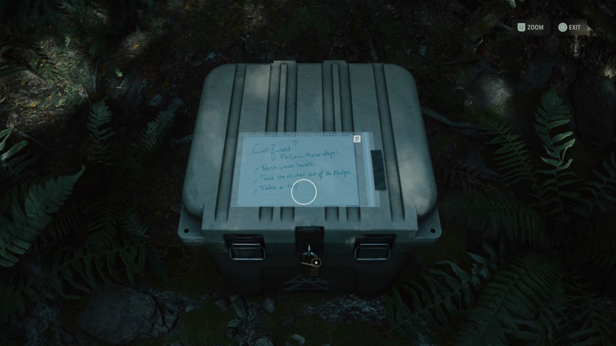 Чуть юго-западнее места убийства стоит стол для пикника, а сразу за ним - запертый холодильник с серией из трех треугольных символов на замке. Скорее всего, это первый тайник, с которым игроки столкнутся в Alan Wake 2, его расположение можно увидеть на карте ниже: