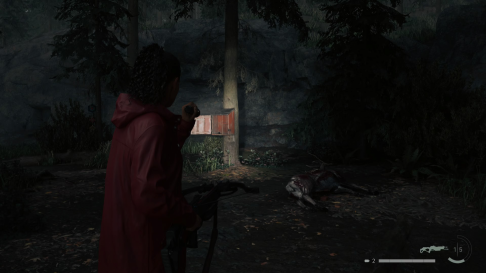 Разобравшись с этими дикими зверями, игроки могут повернуться от ближайшего стола для пикника и направиться к свету убежища. Сразу за конусом исцеления находится красный ящик с припасами, а рядом с ним на земле будет лежать, к сожалению, мертвый олень (в чем, как можно предположить, виноваты волки):