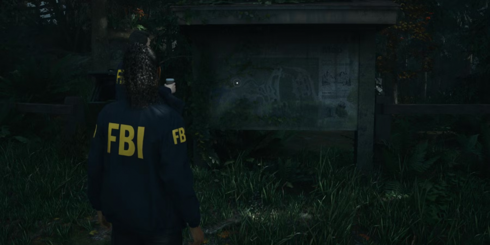 Вернитесь к Кейси и продолжайте следовать за ним к озеру. По пути игроки увидят вывеску с очень знакомой женщиной. Перед табличкой путь вперед окажется прегражденным. Подойдите к нему и осмотрите его, чтобы найти следы и бумагу. Осмотрите их, чтобы продвинуться по сюжету.