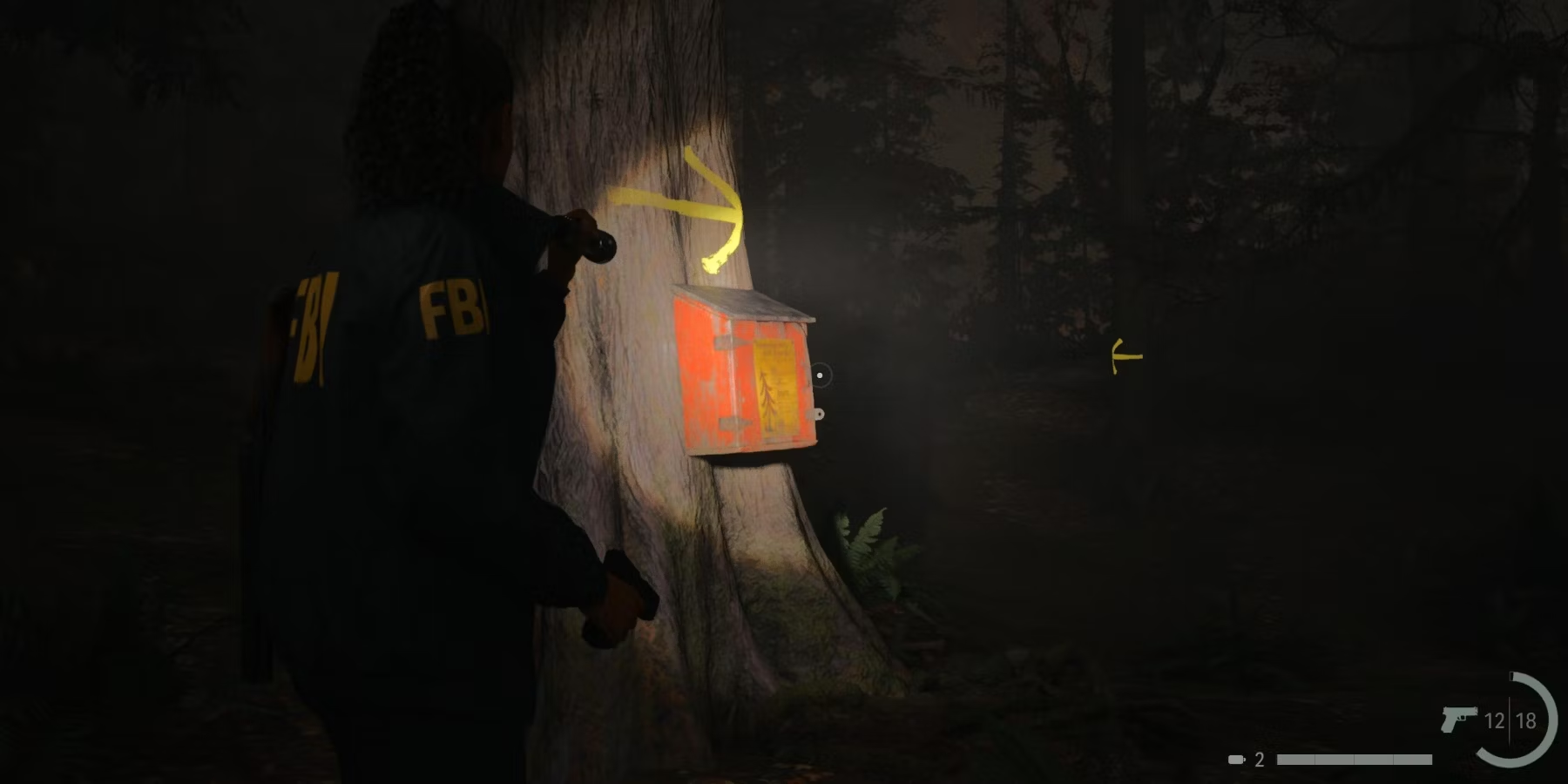 После неожиданной встречи с Аланом Уэйком следующий шаг - вернуться на машине в Брайт Фоллс. Когда игроки снова будут пересекать Ведьмину Лощину, на них нападет волк. Разобравшись с волком, подойдите к красному ящику на дереве. Фонарик покажет желтые стрелки, указывающие направление. Следуйте по этим стрелкам, чтобы найти ключ.