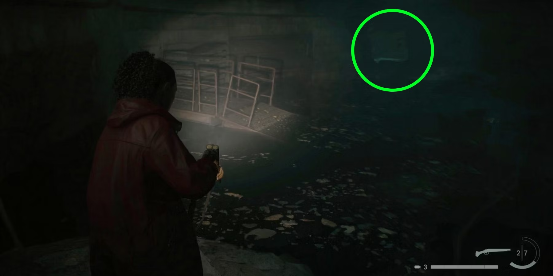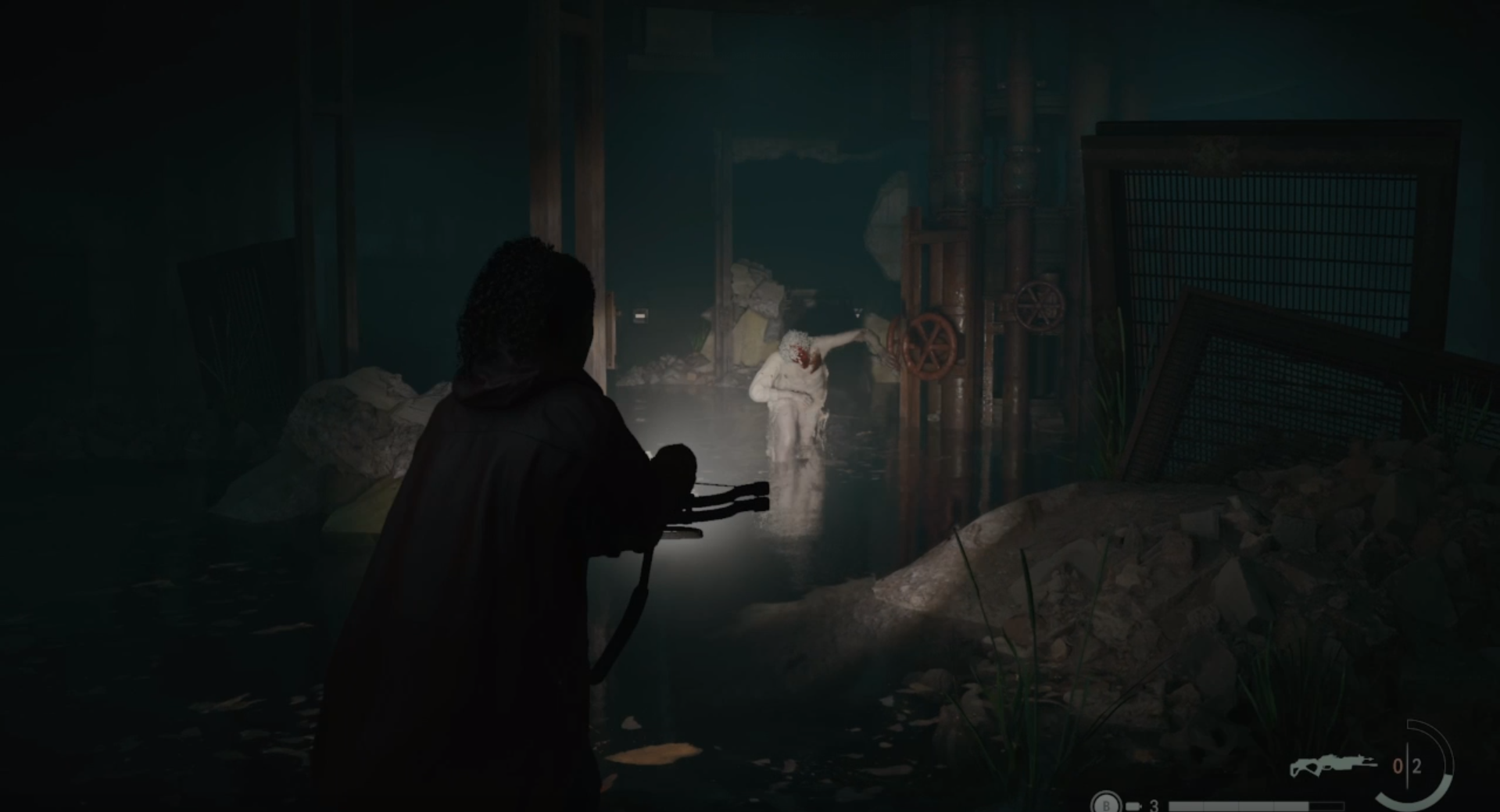 Как только игрок покинет пульт управления и войдет в воду, Синтия будет предупреждена - если Сага будет слишком долго пробираться по воде, Утопленница начнет преследование, и если ей удастся догнать Сагу, она попытается утащить ее под воду, что приведет к неизбежной мгновенной смерти. По всей территории разбросаны камни и металлические платформы, которыми игроки захотят воспользоваться, чтобы вытащить Сагу из воды и остановить преследование Синтии. От центрального терминала игроки должны направиться в заднюю часть комнаты, в сторону от места появления Синтии, в поисках прохода через стену в дальний коридор.