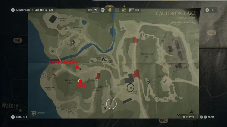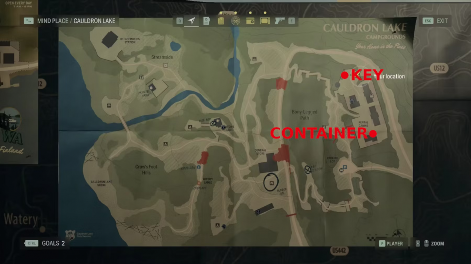 - Примечание: Ключ от тайника Lake Cabins находится у основания дерева в месте, отмеченном на карте выше. Здесь описаны действия, которые необходимо выполнить, чтобы добраться до него: