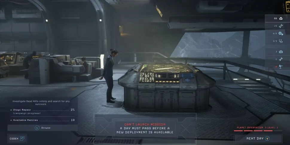В меню командной палубы игроки могут заметить красную полосу в правой части экрана под названием "Заражение планеты". Это означает, насколько заражена планета Lethe, измеряется в уровнях, но может двигаться вверх или вниз в зависимости от действий и выбора игроков.