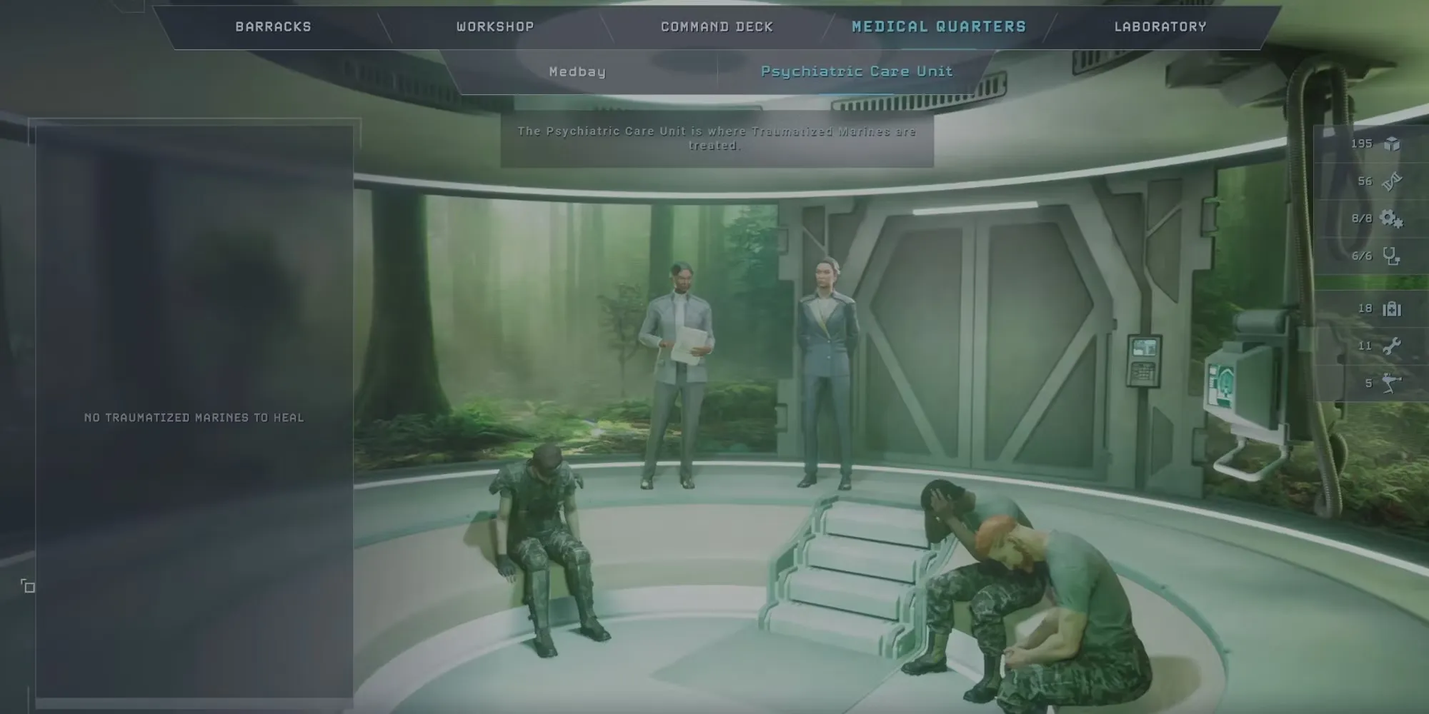 Если морпех страдает от негативных признаков травмы, он может пройти лечение в отделении психиатрической помощи в медицинском отсеке главной базы на борту корабля "Отаго", который игроки должны будут разблокировать по мере прохождения игры. Разумно давать морпехам время на отдых и полное восстановление между миссиями, так как накопление негативных черт будет вредить выживанию морпеха.