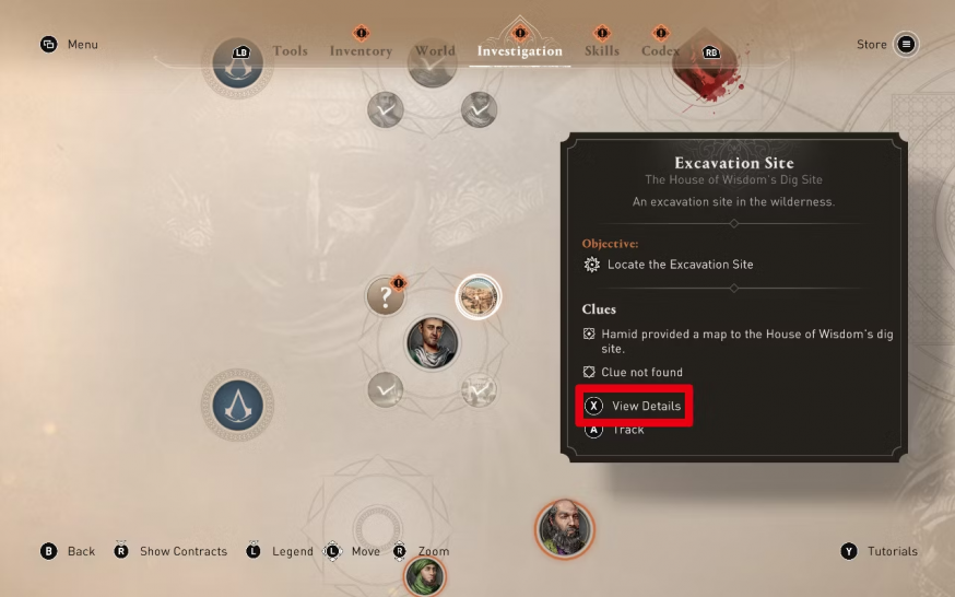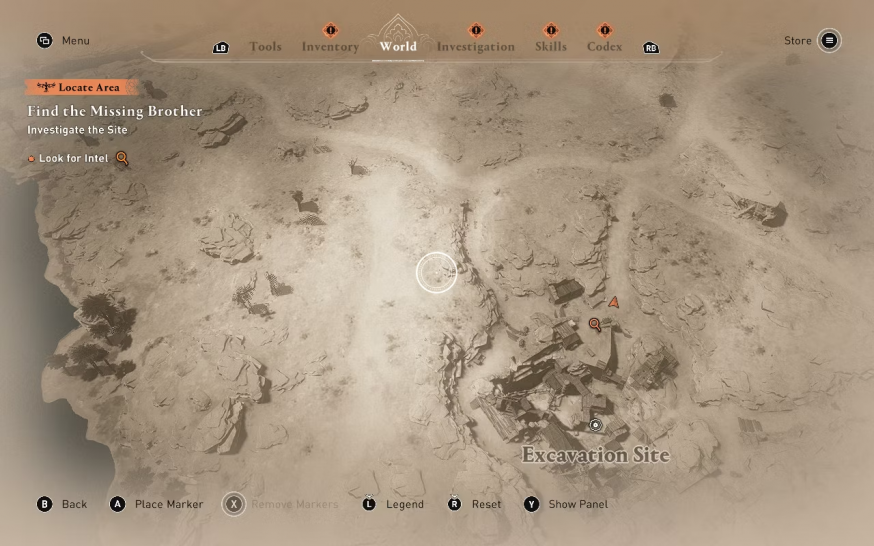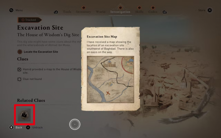 Чтобы найти место раскопок, игроки AC Mirage должны открыть меню Investigation, выделить узел Excavation Site и нажать кнопку View Details. В результате откроется меню, содержащее более подробную информацию о деле, и в левом нижнем углу (в разделе Related Clues) игроки должны выделить пункт Excavation Site Map. После этого игроки должны нажать кнопку Read (Прочитать), чтобы открыть карту с указанием местоположения места раскопок.