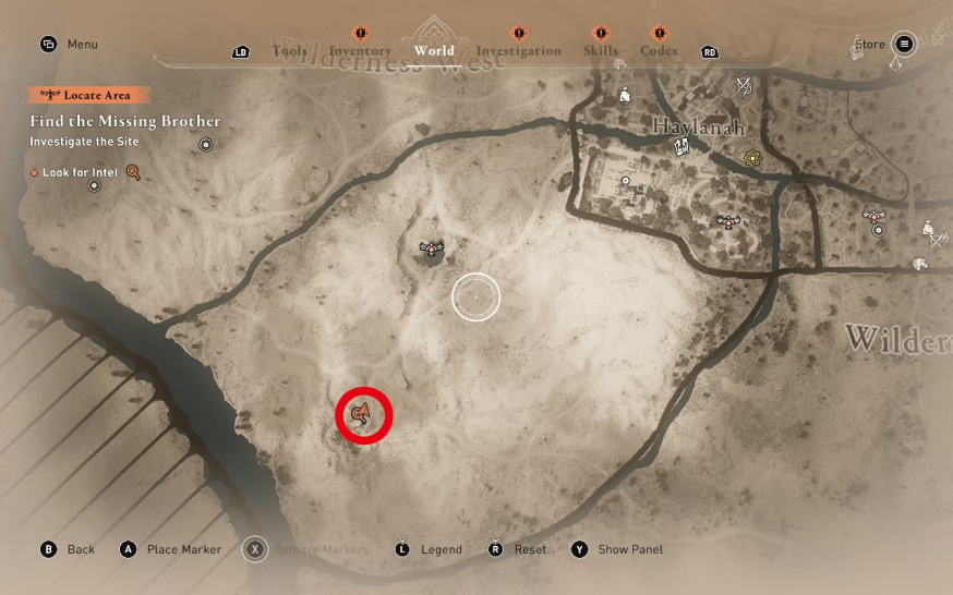 Для тех, кто открыл карту раскопок, но все еще не может найти их местоположение, отметим, что они находятся к юго-западу от территории Аббасии в Дикой местности AC Mirage. Точнее, место раскопок находится к юго-западу от небольшого оазиса, где можно найти точку обзора, и отмечено на следующих картах.