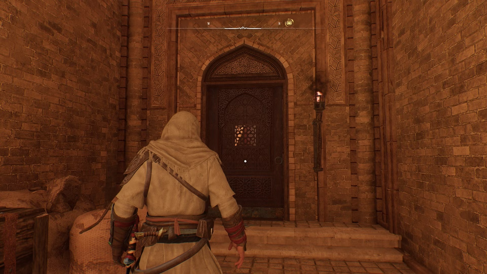 Этот путь должен приблизить игрока настолько, чтобы на компасе появился значок сундука с предметами. Затем с помощью "Орлиного зрения" или "Энкиду" можно определить его точное местоположение. Он находится на втором этаже, и рядом с ним есть дверь, но она заперта. На втором этаже слева от сундука находится дверь, но она также заперта.