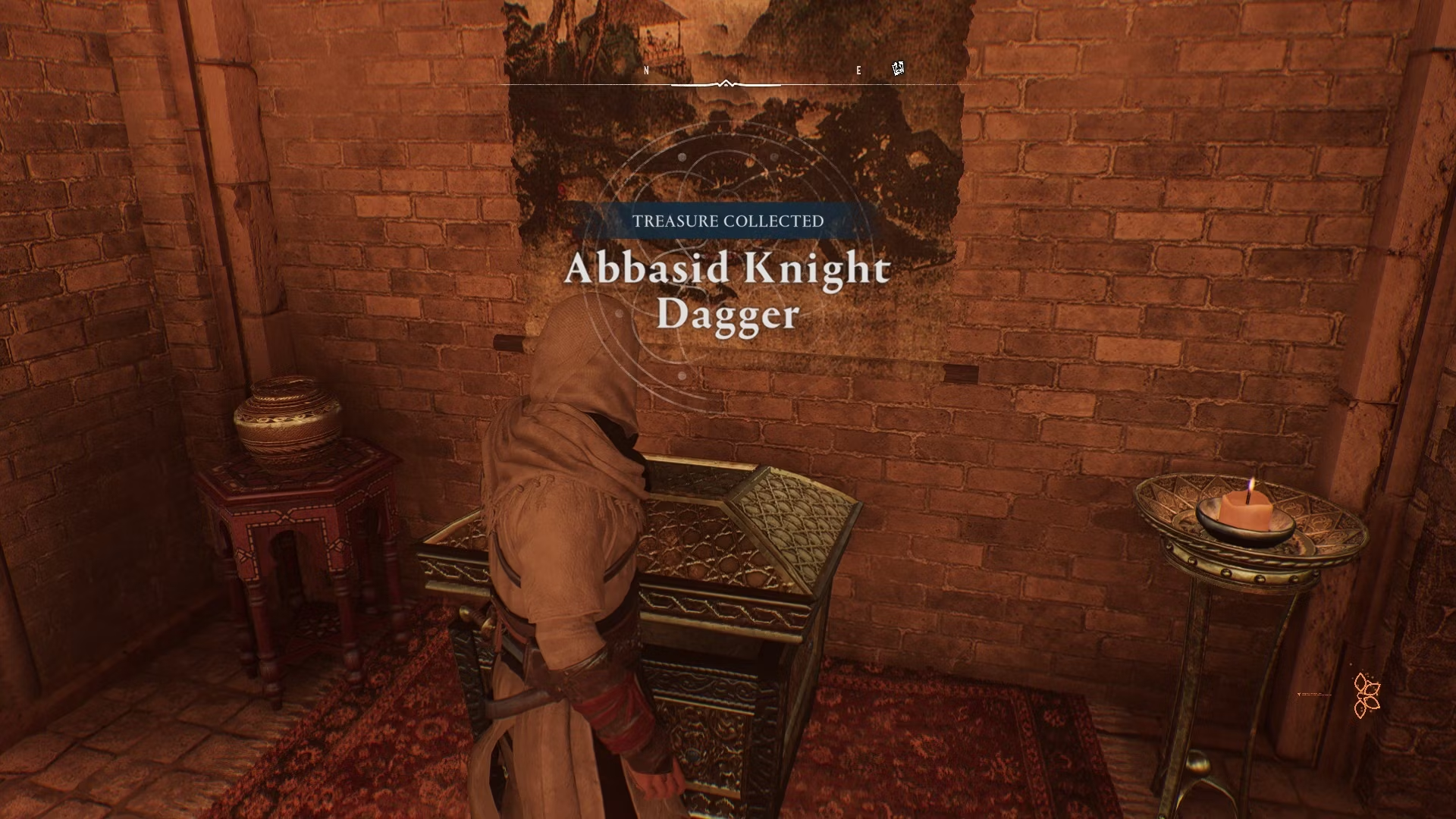 В этом сундуке находится кинжал рыцаря Аббасидов. Он наносит тот же урон, что и стартовый кинжал, но обладает особой способностью "Стойкость": когда здоровье Басима падает ниже 50%, его сопротивление урону увеличивается на 30%.