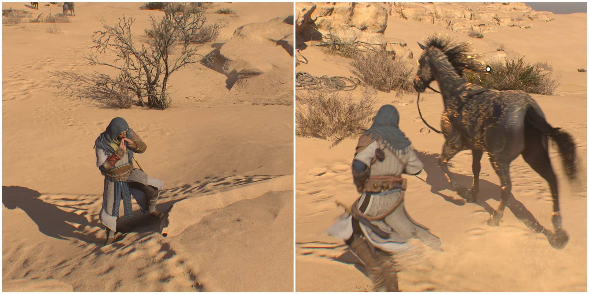Самое приятное, что в Assassin's Creed Mirage геймер может в любой момент вызвать своего коня или верблюда, и он появится рядом, независимо от расстояния между Басимом и его животным. Это работает, даже если в последний раз они ехали на лошади за сотни метров от текущего местоположения.