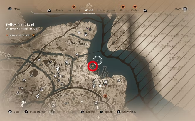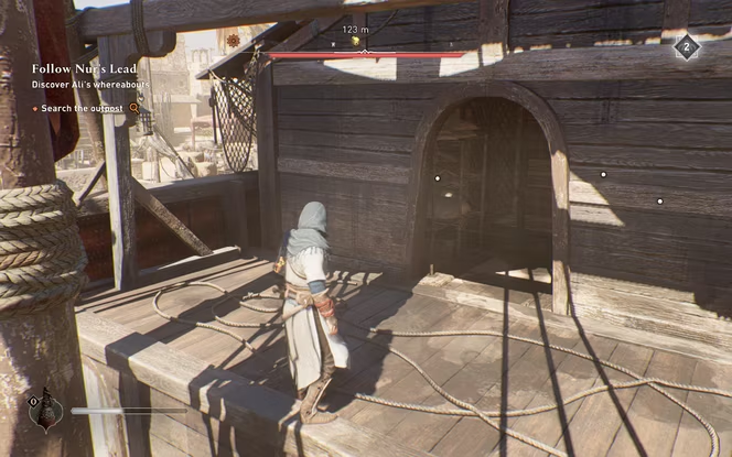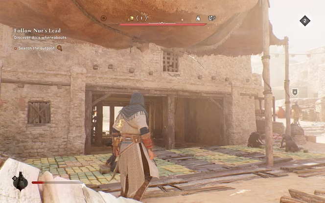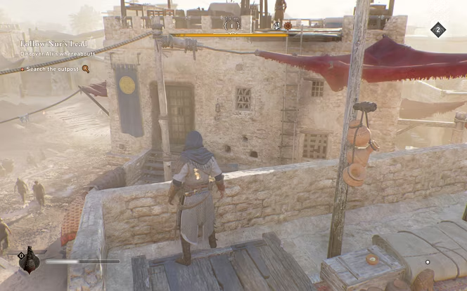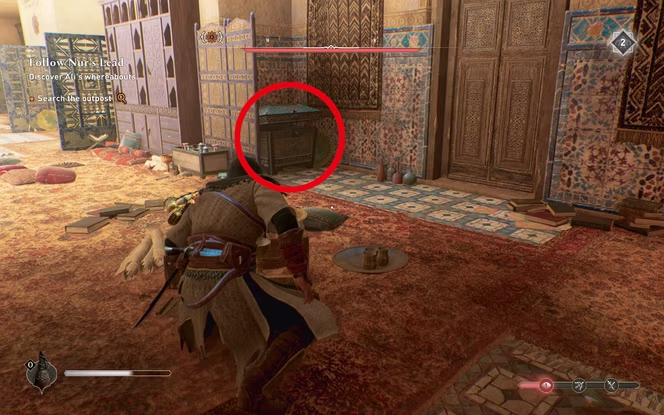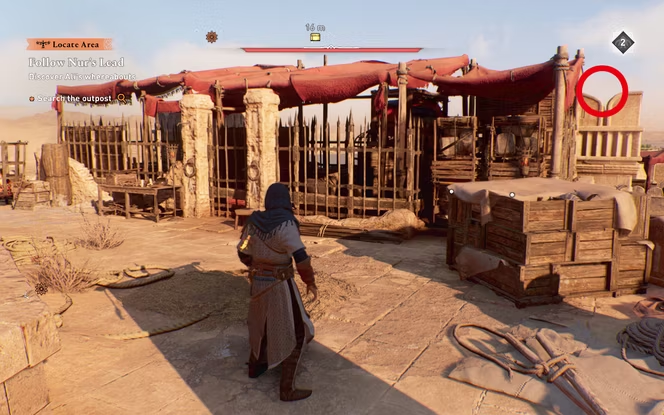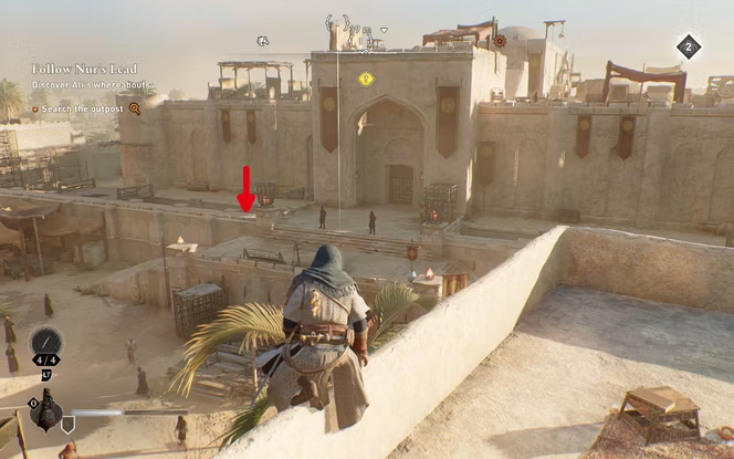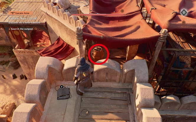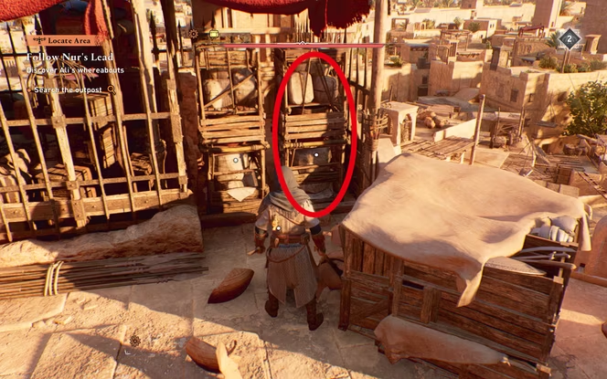 Добравшись до вершины сторожевой заставы Khursan Gate, игроки должны забраться на красную ткань, закрывающую клетку Gear Chests, расположиться на башне в юго-восточном углу и повернуться лицом к клетке. С этой позиции игроки должны использовать оружие ближнего боя в AC Mirage, чтобы разрушить соломенную часть клетки, а затем бросить нож в открывшийся горшок. В результате полка, на которую можно попасть с передней стороны клетки, станет подвижной, и игрок получит доступ к находящемуся внутри сундуку.