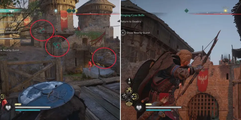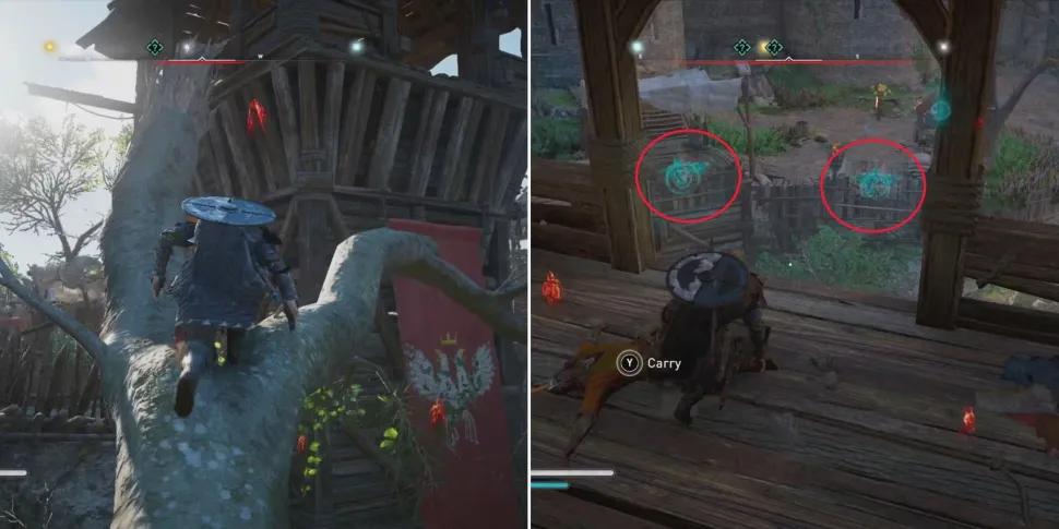 Приближаться к замку в упор - сложная задача и не в духе этого квеста на проникновение/невидимость. Вместо этого игрокам следует направиться к северным стенам и поискать нависающее дерево, которое может бесшумно привести их в укрепления. Возле северных стен находится пара спрингалдов, а возле южных - еще два спрингалда и котел с маслом. Эти спрингалды - то же самое оборонительное оружие, которое игроки могли использовать в эпизоде Лунден в Assassin's Creed Valhalla. Их можно вывести из строя меткой стрелой или саботировать вблизи.
