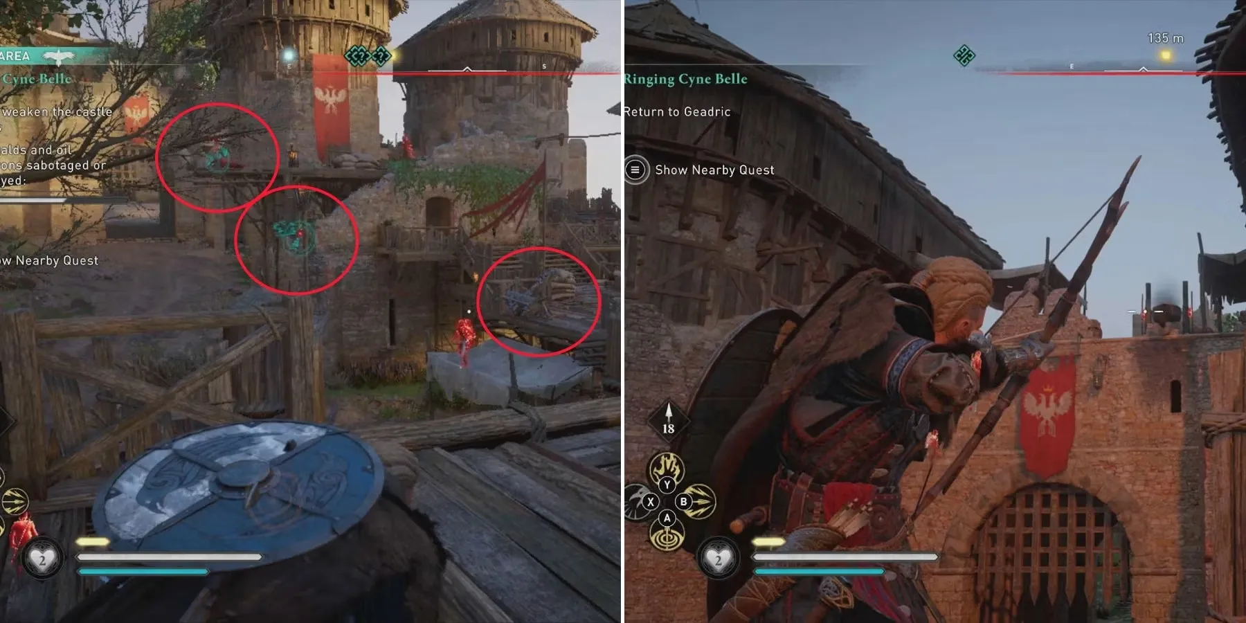 Уничтожения/разрушения всех пяти этих защитных предметов будет достаточно для завершения квеста, и игроки могут вернуться к Гедрику на этом этапе. Однако есть множество других возможностей значительно облегчить выполнение следующего задания, и все они находятся либо вдоль каменных стен, либо во внутренней части замка Cyne Belle. На вершине ворот находится пара котлов с маслом, которые можно отключить, а прямо внутри этого внутреннего двора на вершинах зданий стоят еще несколько спрингалдов.