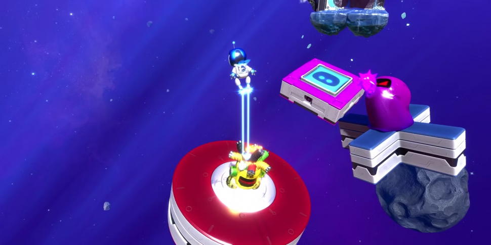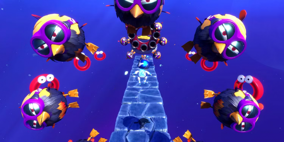 Следующий участок довольно прост, если двигаться и следить за снарядами двух фиолетовых врагов. Стоит отметить, что второй из них может попасть в Астро с довольно большого расстояния, поэтому игрокам не стоит торопиться, используя большие подвижные блоки в качестве укрытия и перемещаясь в воздухе, когда это необходимо.