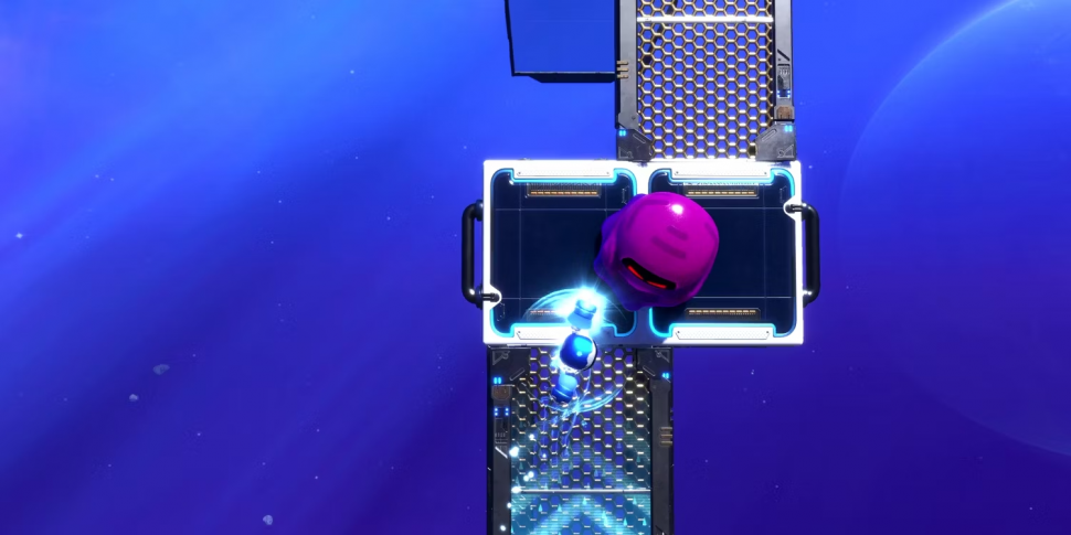 Хитрость следующей секции заключается в том, чтобы продолжать двигаться. Велика вероятность, что на втором этаже к Астро прицепится один из мелких врагов, но это не страшно. На следующем уровне их все равно больше, так что игрокам стоит начать заряжать крутящийся удар после прыжка на вторую площадку, а затем выпустить его, как только они приземлятся наверх.